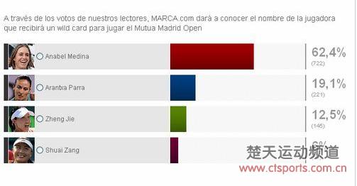 今年的马德里皇冠赛外卡人选再次由网友投票决定,候选者一共有四位,分别是西班牙本土选手加里奎斯、西班牙本土选手桑通加以及中国两名金花郑洁和张帅,目前加里奎斯的票数暂时遥遥领先66.8%,桑通加排名第二,支持率为20.2%,中国金花郑洁排名第三,支持率为8.4%,张帅的支持率为4.6%,票数最高者将获得马德里站女单正赛的外卡。详见下图: