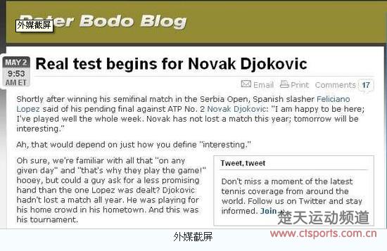 在塞尔维亚公开赛半决赛获胜后,西班牙人菲·洛佩兹这么展望他与世界第二德约科维奇的决赛:“我很高兴来到这里,一整个星期都表现不错。诺瓦克今年还没输过任何比赛,明天会很有趣。”这得看你怎么定义“有趣”了,我们都对一些胡言乱语习以为常,可是洛佩兹面临的情况还能再糟糕一点吗?德约科维奇本赛季一直不败,他在家乡的观众面前打球,这还是属于他的赛事。塞尔维亚公开赛是德约科维奇家族的产业,它借助诺瓦克的巨大成功而进入ATP赛程当中。