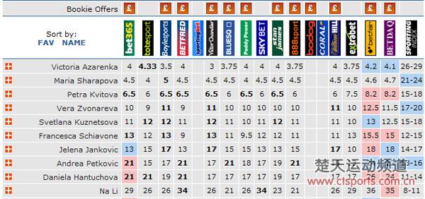 李娜的强势晋级也让她在欧洲博彩公司的夺冠赔率中上升一位。昨天赛前还列在第11位,晋级过后排在了第10位。阿扎伦卡、莎拉波娃、科维托娃仍占据女单夺冠赔率的前三名。