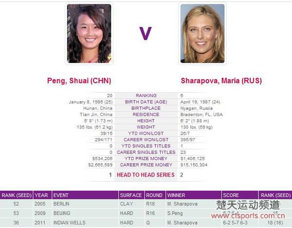 两人首次交手是在2005年的柏林红土赛,当时在第三轮的比赛中莎娃直落两盘以6-2/6-1取得胜利。随后两人长达四年再没有相遇,直到2009年的中网第三轮,主场作战的彭帅还以颜色,以6-2/6-4横扫俄罗斯人取胜,两人互有胜负,2011年的印第安维尔斯是两人的第三次交手,在1/4决赛莎娃苦战三盘以6-2/5-7/6-3艰难取胜。应该说从战绩方面尽管彭帅稍微处于劣势,但是从近期的状态来看,中国金花获胜的赢面也很大。