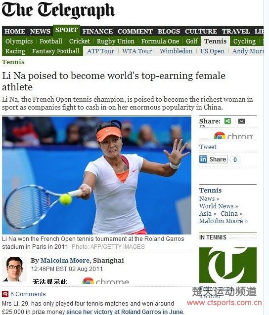 英媒认为李娜有望超越莎娃成为最红的吸金女王。