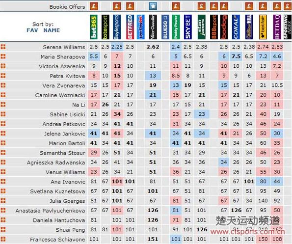 如图所示,温网前匆匆复出的小威目前已经成为各大博彩公司的宠儿,全部13家博彩公司都为小威开出了最低赔率,对黑珍珠非常的信任,有两家公司同时开出了2.38的最低赔率。而处在第二位的就是玛利亚-莎拉波娃,日渐成熟的俄罗斯美女依然值得信赖,在夺冠赔率中,她稳稳占据着第二的位置。