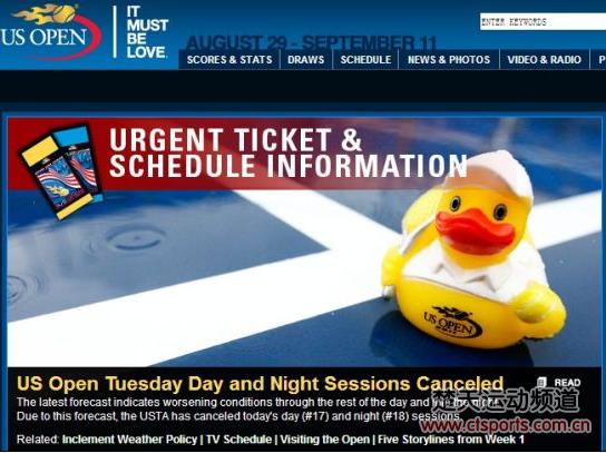今日消息,2011年美国网球公开赛进入到了第9个比赛日,但是一场突如其来的大雨致使比赛无法按时开始,在等待了3个多小时之后,美网组委会宣布第9日的比赛全部取消。