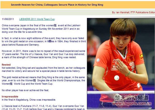 乒联文章指出,在决赛场上丁宁没有上场,但是枚团体金牌让丁宁成为了在同一年拿到世锦赛女子单打冠军、女子世界杯和团体世界杯桂冠的第一人。这样的赫赫战绩,之前还没有人拿到过。