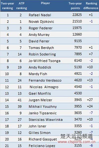 按照两年排名积分系统,顶尖选手们的排名变化。