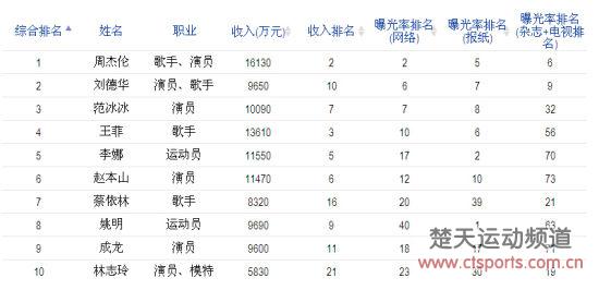 根据《福布斯》杂志的统计,其最近一年的收入高达1.155亿人民币,总排名同样位居第五位,排名张学友、周杰伦、王菲以及甄子丹之后,但仍旧高居体育圈第一位。