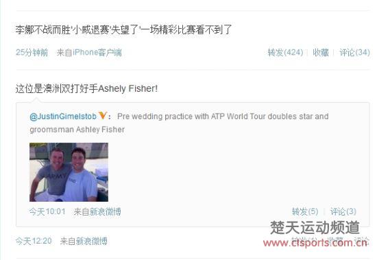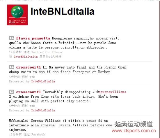5月20日消息,总奖金2,166,400美元的WTA超五赛罗马网球公开赛展开了半决赛的争夺。按计划8号种子、中国金花李娜将在中心球场迎战迎战状态正佳的小威廉姆斯,但据WTA亚太区副总裁兼赛事监督陈述在微博和罗马站的官方Twitter透露,小威因下腰部伤势在比赛前临时退赛,这也就直接保送李娜晋级决赛,这是她首次闯入超五赛的决赛,在决赛中的中国金花的对手将是莎娃和科贝尔之间的胜者。