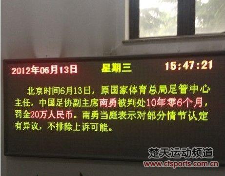 足坛判决结果出现在乒羽中心显示屏上