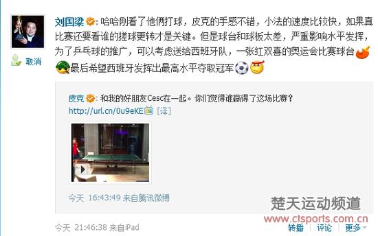 视频中两人对攻的节奏相当快,亦如西班牙队不停歇的传递一样,可以看出法布雷加斯明显要技高一筹。刘国梁转发皮克的微博并对两位足球明星的乒乓球技进行点评:“哈哈刚看了他俩打球,皮克的手感不错,小法的速度比较快,如果真比赛还要看谁的搓球更转才是关键。但是球台和球板太差,严重影响水平发挥,为了乒乓球的推广,可以考虑送给西班牙队,一张红双喜的奥运会比赛球台,最后希望西班牙发挥出最高水平夺取冠军”刘国梁的点评可谓是极为专业,同时不忘推广乒乓球。