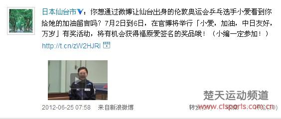 6月26日消息,随着伦敦奥运会日益临近,运动员们都在积极备战训练当中,不过日本乒乓球名将福原爱近日忙里偷闲,她录制了一段视频,通过家乡仙台市的微博向网友们送上祝福。
