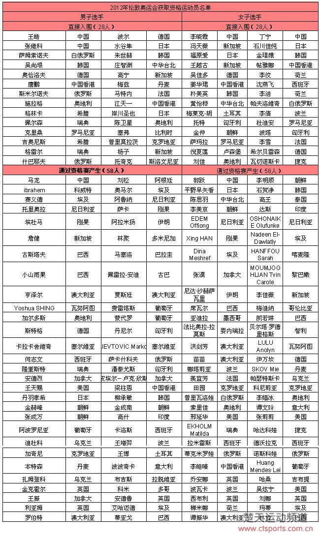 通过资格赛产生(58人) :