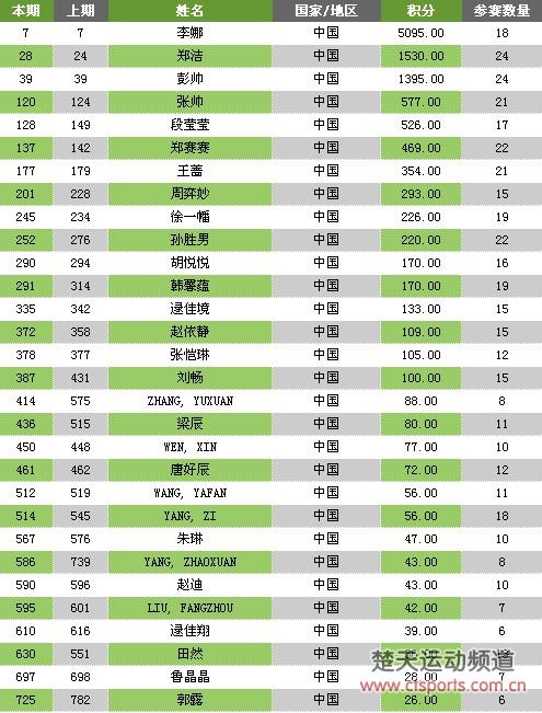 赛事纵横-10月17日消息,图为WAT单打最新世界排名,中国女金花李娜仍居世界第7位,全国首位。郑洁小降4位,居世界28位,全国2位。值得一提的金花段莹莹上升21位,超过郑赛赛位居世界137位,全国第5位。