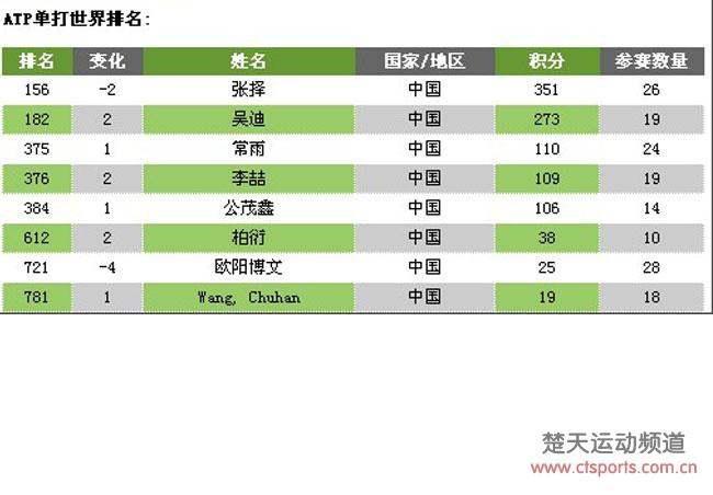 11月12日消息,ATP公布了最新一期世界排名。张择下降2名位居世界单打排名第156名,吴迪上升2名位列世界第182名。常雨小升1名位于375名,李喆升2名为376紧次常雨一名。