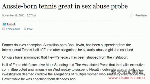 11月17日消息,曾经的“澳洲野兔”鲍勃-休伊特因为涉嫌对其正在执教的女学生进行性侵犯而遭到警方调查。国际网球名人堂也暂时剥夺了其名人堂成员的身份。
