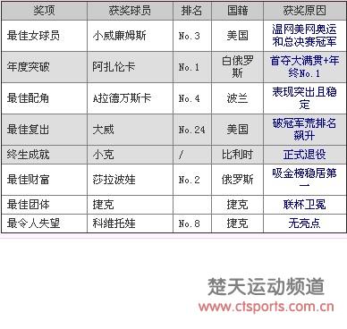 网坛快讯-11月26日消息,WTA赛季获奖名单列表,小威廉姆斯获最佳女球员奖,获奖赛程是温网美网奥运和总决赛冠军。