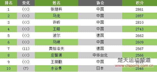 男单方面,大满贯得主张继科依旧高居榜首,夺取世界杯冠军的马龙紧随其后,缩小与张继科的分差。尽管无缘世界杯领奖台,但许昕依旧位列第三,没有出战世界杯的王皓位列第四。世界杯亚军波尔超越马琳升至第五,马琳第六,日本水谷隼第七,庄智渊升至第八,王励勤第九,世界杯赛小组未出线的奥恰洛夫跌至第十。