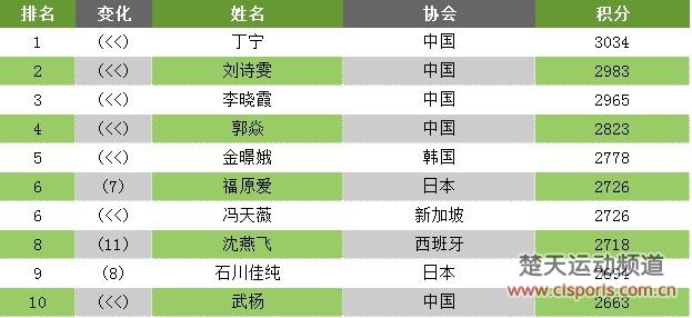 女单方面,丁宁刘诗雯李晓霞郭焱继续排名前四位,令人遗憾的是郭跃,这位今年奥运会后参加国际不多的名将,遗憾的跌出了前10,暂列第11位。