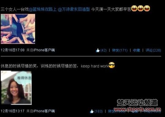 李娜先是发了一条“休息的时候尽情的笑,训练的时候尽情的苦,keep hard work”的微博,并配了一张自己笑得很开心的照片,随后傍晚时分,她又发了一条微博,秀了与两位好友相聚时拍的创意照片,展现了自己小女人的一面,也看得出经过一天的休息放松,金花一姐度过了愉快的一天。