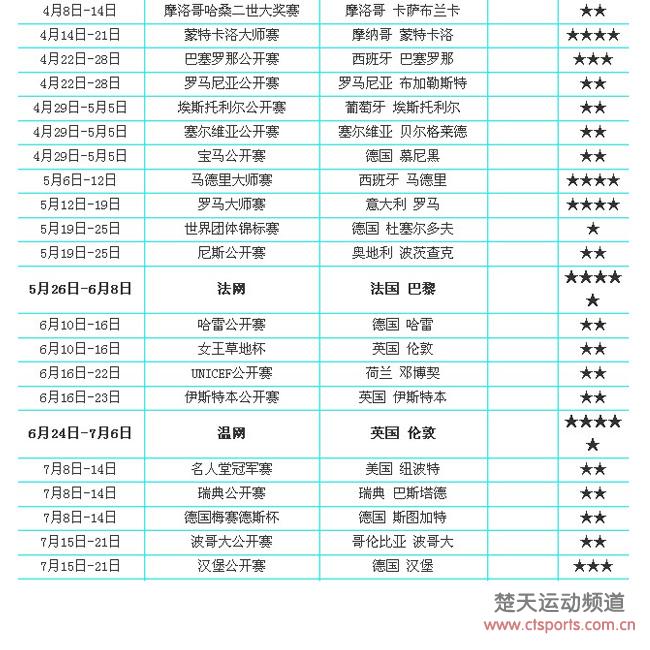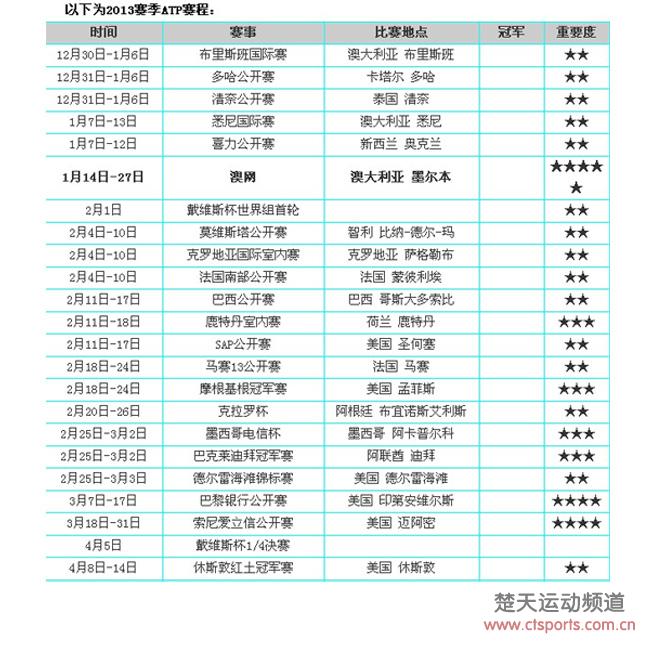12月18日消息,ATP2013赛季首个大满贯澳网将于1月14开启大幕,而收官战年终总决赛则被安排到了11月4日进行。备受中国球迷关注的中网将从9月30日开始,而1000分赛事上海大师赛则将在10月7日揭幕。 ,在澳大利亚的布里斯班、卡塔尔的多哈和泰国的清奈三站赛事将同时打响。