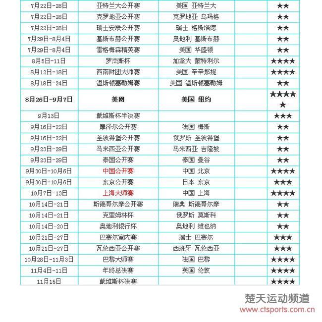 赛事纵横-12月18日消息,ATP2013赛季首个大满贯澳网将于1月14开启大幕,而收官战年终总决赛则被安排到了11月4日进行。备受中国球迷关注的中网将从9月30日开始,而1000分赛事上海大师赛则将在10月7日揭幕。 ,在澳大利亚的布里斯班、卡塔尔的多哈和泰国的清奈三站赛事将同时打响。