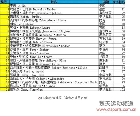 12月25日消息,2013深圳金地公开赛简介,本次深圳金地公开赛的总奖金高达50万美元,单打正赛为32签,双打正赛为16签,另外还有16签的单打资格赛。除了李娜、巴托丽、扬科维奇等名将外,还有来自超过15个国家和地区的选手将为争夺冠军殊荣而战,这其中包括世界排名第25的中华台北选手 谢淑薇,排名第28名的捷克选手克拉拉·扎卡帕洛娃,来自英国的前温网青少年组女单冠军 劳拉·罗布森,以及来自中国的金花彭帅。