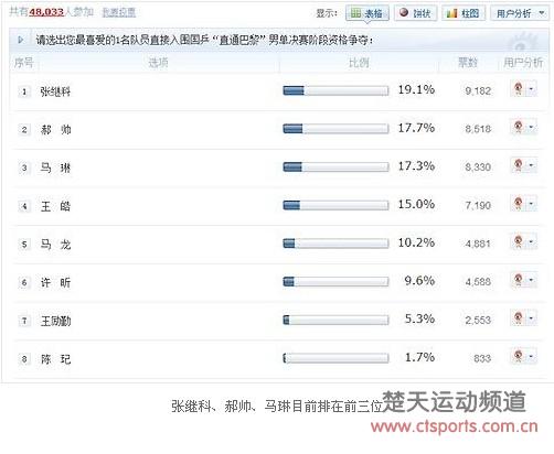 1月9日消息,2013年世界乒乓球单项锦标赛将于5月13-20日在法国巴黎举行,中国乒乓球男队世乒赛选拔赛第二阶段选拔采取了新颖的网络投票方式,得票最高的3名队员可以直接进入第三阶段。截止北京时间1月9日9点30分,张继科、郝帅和马琳暂时排在前三位。