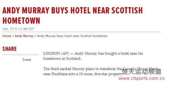 2月26日消息,去年美网夺冠之后,英国媒体计算穆雷将获得超过1亿英镑的商业收益,从日前英国宠儿大手笔买下哥哥吉米结婚的酒店来看,穆雷现在的确是身家不菲。