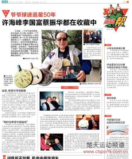 49届世乒赛在广州举行的时候,国际乒联主席萨拉拉也来到广州,当时陈爷爷买了最好的球票坐在第一排,看着萨拉拉就近在咫尺,心头难免又犯了要签名的瘾。“可是当时保安不让我去啊,我就据理力争嘛,‘我这是最贵的票都不能去吗?’那保安还是说不行,后来我就拿出李国富跟我的合影,我就跟他说,‘我打球的球龄比他们的年纪都长呢。’旁边的人听了也是笑,帮着劝那个保安,后来不就放我过去了吗。”
