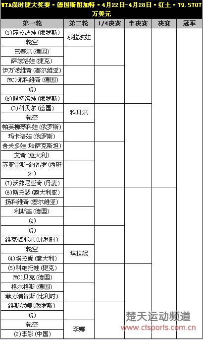 网坛快讯-4月25日消息,WTA2013总奖金额为79.5707万美元的顶级巡回赛保时捷大奖赛于今日到4月28日在德国斯图业特举行,此前本次的保时捷网球大奖赛公布正赛签表,中国金花李娜将再次打响红土赛季,她与俄罗斯名将莎拉波娃领衔众人,与科贝尔和埃拉妮一起享受首轮轮空待遇。