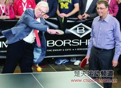 美国《华尔街日报》报道,“股神”巴菲特旗下的伯克希尔哈撒韦公司在美国中部小镇奥马哈召开2013年股东大会。而在会议间歇,巴菲特与公司董事、微软创始人比尔-盖茨一同打起了乒乓球,给出席会议的股东们带来一场史上“身价最高”的乒乓球赛。