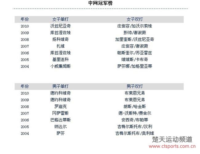 2013年中网中央电视台体育频道、CNTV一网打尽频道、悠视网等将进行全程实况直播,让海内外观众一饱眼福,敬请收看!
