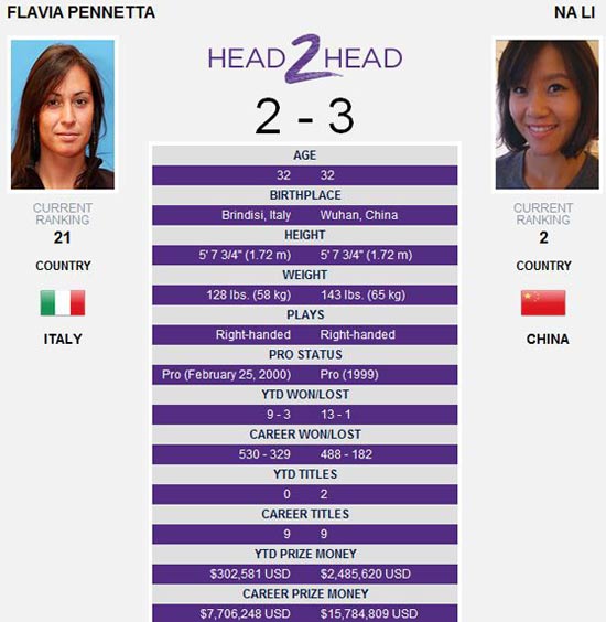 两人最近一次交手是在2014年的澳网,当时李娜仅用时67分钟便以两个6-2横扫意大利人,第四次杀入澳网女单半决赛。而第一次交手是在2000年的意大利奇维塔诺瓦站,当时李娜6-4/6-1获胜。回顾两位老将的五次交手,四次比赛是在硬地场,双方2-2战平。