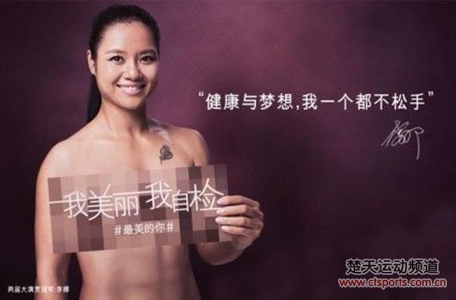 而就在今天,李娜在微博上公布了自己半裸上身的广告宣传照,宣传照有“健康与梦想,我一个都不松手”的公益广告语。中国一姐露出灿烂的笑容,半裸上身,不过敏感部位打上了马赛克,上面还有“我美丽我自检”的宣传语。