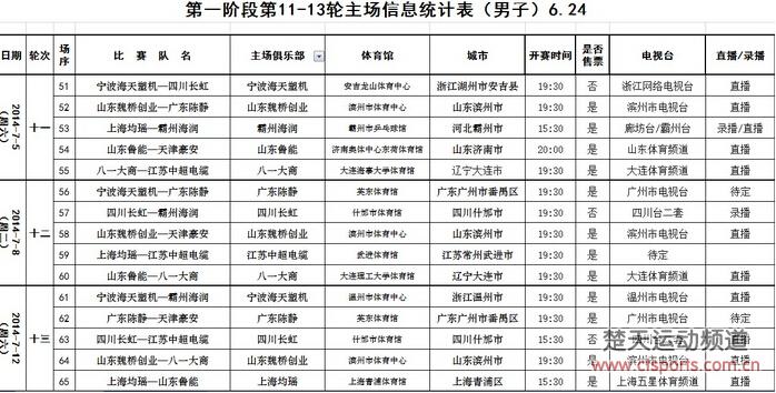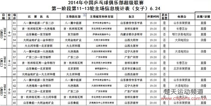 以下是2014乒超联赛第一阶段第11-13轮主场统计表及转播信息: