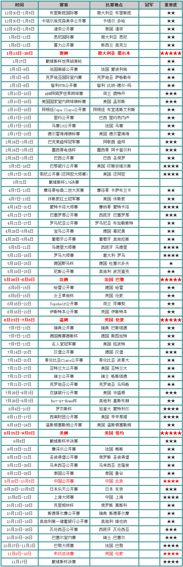 2014年ATP网球比赛赛程时间表: