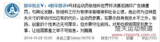 昨天中午12点,新华社新华视点微博对张继科事件发表评论,“乓球运动员张继科世界杯决赛后踢坏广告牌遭罚,引舆论发酵。张继科之行为有悖体育精神和社会公德,他必须为这种显失分寸的举动付出应有的代价。运动员参赛,在展示自身竞技水平之外,张扬、创意的个性表达无可厚非,但亦要守住底线,对那些损毁国家形象之事、让祖国蒙羞之举不可姑息。”