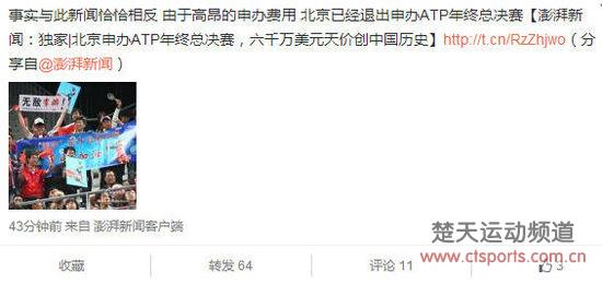 日前,中国网球公开赛营销及品牌管理中心总监何华立通过个人微博称北京已经退出申办ATP年终总决赛,原因是申办费用高(达到6000万美元)。
