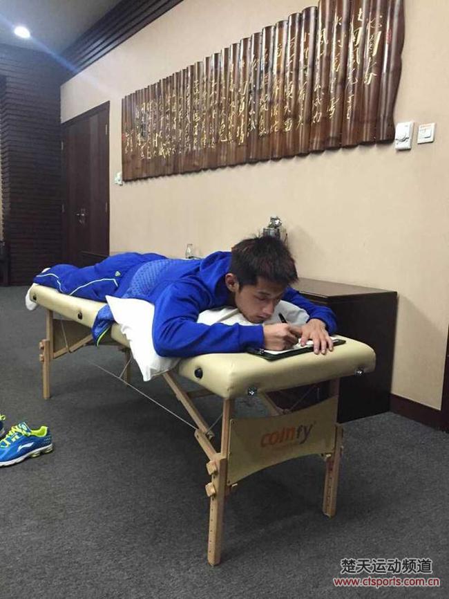 5月初,张继科出现在国乒世乒赛总结会现场。不过由于腰伤,他无法坐在那里,队医只能搬来医疗按摩床,一上午的总结会,除了发言期间勉强坐了起来,张继科只能全程趴在床上,边记笔记。