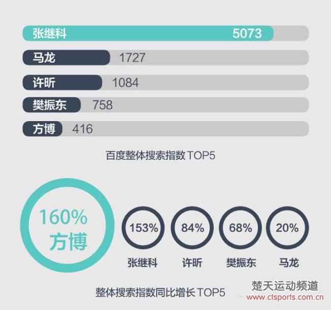 世乒赛冲击男单三连冠梦碎、6个月无单打冠军入账、世乒赛后饱受伤病困扰,半年来张继科的整体走势难言完美。但在很多球迷眼中,张继科仍是不折不扣的国乒一号人物。世乒赛中引发的“Do The ZhangJike”模仿秀、科龙大战的关注度、和许昕的激情撞胸,再加上乒超联赛期间的伤病困扰,这名天生的话题人物,在百度整体搜索指数中牢牢占据首位,领先第2名的马龙近两倍。与去年相比,张继科的整体搜索指数同比增长153%,仅次于方博居于第1位。