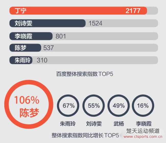 颜值颇高的陈梦,也在世乒赛期间人气剧增,她和法国选手莱贝松的跨国配对,一度成为球迷关注的焦点。世乒赛后,陈梦在日本公开赛中连胜丁宁和朱雨玲获得女单冠军,迎来了新一轮的爆发。出色的发挥和足够的热点,陈梦成为了上半年搜索指数同比增长幅度最大的女乒运动员。另外,和闫安组成“攻削配”的武杨,人气同样大幅度增长,排在第4位。