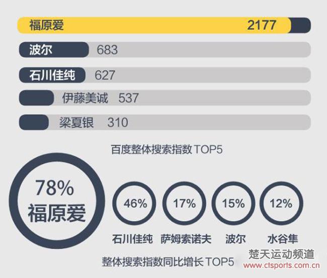 百度整体搜索指数排行榜中,“瓷娃娃”福原爱以2177票稳居头名,领先第2名的波尔两倍有余,是国外选手中名副其实的“人气王”,搜索指数已比肩丁宁。近半年来发挥出色的小将伊藤美诚,也跻身排行榜前5,排在第4位。居于末席的是韩国选手梁夏银,凭借和许昕跨国组合夺冠,也为她赢得了非常高的人气。