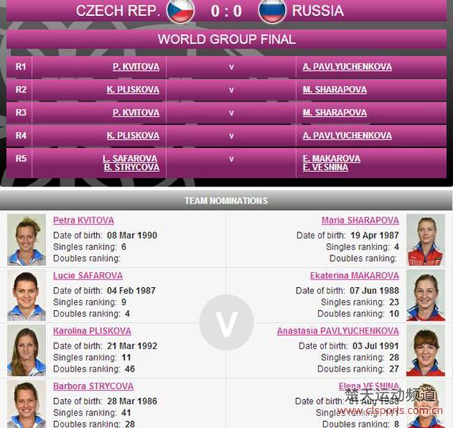 2015年联合会杯决赛签表已经出炉,今年的联合会杯决赛,刚刚伤愈复出的俄罗斯美女莎拉波娃率领俄罗斯队强势来袭,对阵由科维托娃领衔的老牌战队——捷克,根据签表来看,莎娃的首场比赛对手为捷克新秀普利斯科娃,第二场就将与老将科维托娃交手,据悉,这是莎拉波娃首次参加团体赛。本次联合会杯决赛将在捷克布拉格的O2室内体育馆进行。
