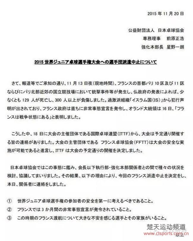 报道称日本乒协给出了三点理由:参赛选手安全应放在第一位;法国19日投票通过延长紧急状态至三个月;选手及其家人对前往法国感到恐慌。日本杂志《卓球王国》还特别指出,本届比赛女队派出的伊藤美诚、平野美宇、佐藤瞳等,是史上最强阵容,国内呼声极高,无奈因国际局势不得不放弃参赛。
