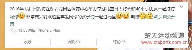 距离2016年中国首项网球赛事——WTA深圳公开赛开赛只剩下2天,昨日,李娜在微博自曝将于1月1日现身深圳,出席2016深圳网球公开赛儿童日,与40位网球儿童近距离接触。
