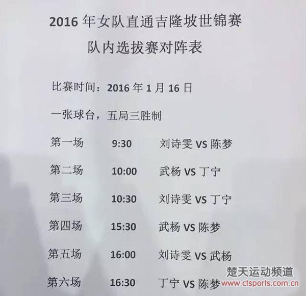 根据国乒女队日程安排,在熟悉中山的训练环境之后,国乒女队将于1月16日展开2016世乒赛直通赛第二轮,本次出战的选手为丁宁、刘诗雯、陈梦、武杨4人,仍旧采取5局3胜制循环赛,最后净胜局排名第一的获得2016世乒赛直通卡。