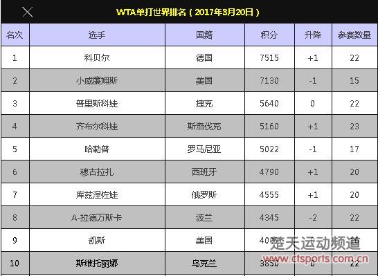 2017印第安维尔斯皇冠赛结束之后,WTA新一期世界排名也已出炉,获得2017印第安维尔斯皇冠赛女单冠军的维斯尼娜连升2位现为世界第13。由于小威廉姆斯因伤退赛,科贝尔重获WTA世界第一之位。除此之外,TOP10球员中,齐布尔科娃、穆古拉扎、库兹涅佐娃均上升一位,A-拉德万斯卡由于早早爆冷出局,连跌两位,纤维世界第八。
