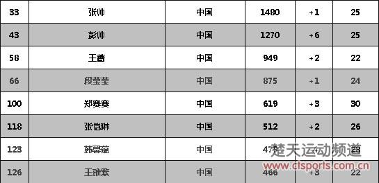 中国金花方面,张帅小升一位,彭帅连升六位,王蔷上升2位,段莹莹上升一位,郑赛赛上升三位,张凯琳上升2位,韩馨蕴下滑4位,王雅繁上升三位。