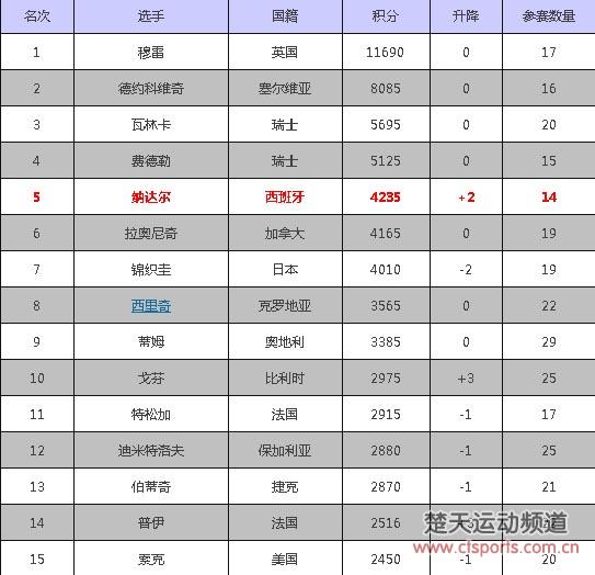 2017蒙特卡洛大师赛结束之后,最新一期的ATP世界排名出炉,蒙特卡洛十冠王纳达尔连升两位排名世界第五,爆冷击败德约科维奇的比利时名将戈芬,连升三位重返世界前十。蒙特卡洛赛亚军拉莫斯上升5位排名世界第十九。