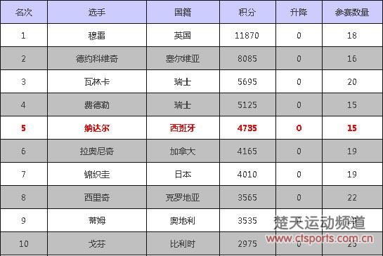 虽然穆雷和德约科维奇在红土赛季战绩平平,但凭借此前累积的巨额积分,两人还是牢牢占据ATP世界前二之位。