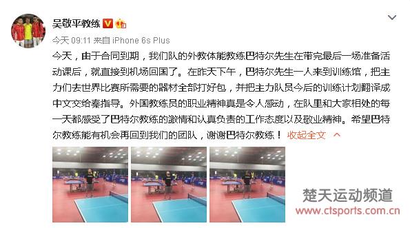 在张继科因为脚伤退出了2017卡塔尔乒乓球公开赛之后,为了帮助其更好的回复,中国乒乓球队特意聘请了外国体能教练巴特尔团队,为国乒服务。今早,吴敬平教练放出消息称巴特尔与国乒合约已经到期,将于今日回国。